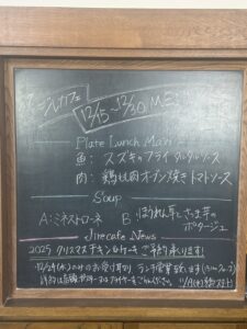 【9.16-10.4】Menu 2025年9月16日 最終更新日時 : 2025年9月16日 jirecafe_admin 本日メニュー更新日です。 次回メニュー更新日は10月6日(月)です。 ◆プレート(お弁当)メイン 魚:サンマの香草パン粉焼き 肉:鶏天 ポン酢添え ◆スープ A:ミネストローネ B:かぼちゃのポタージュ