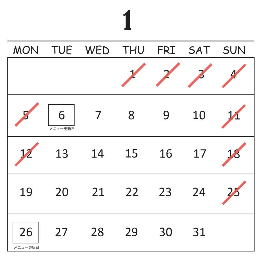 1月の営業日について 2025年12月26日 最終更新日時 : 2025年12月26日 jirecafe_admin 1月の営業日については下記カレンダーをご参照ください。 1月5日まで年始のお休みとなります。 1月6日(火)より通常営業、メニュー更新日となります。 毎週日曜日、祝日はお休みとなります。